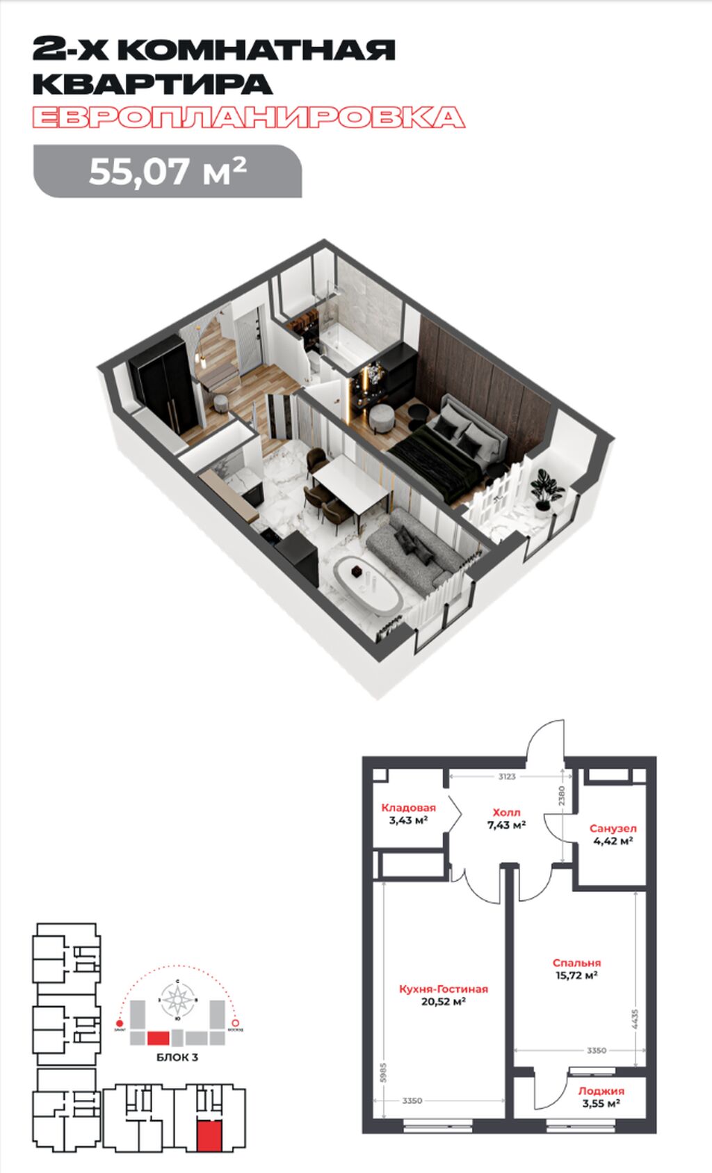 🔹Площадь: 55,07 м2