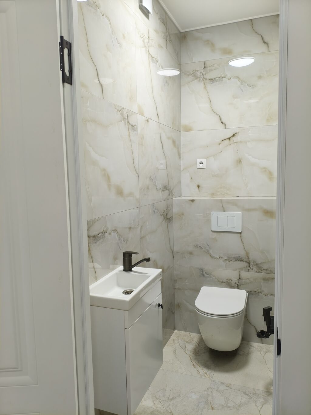 Санузел в плитке «под мрамор»: ванна, подвесная тумба, зеркало с подсветкой