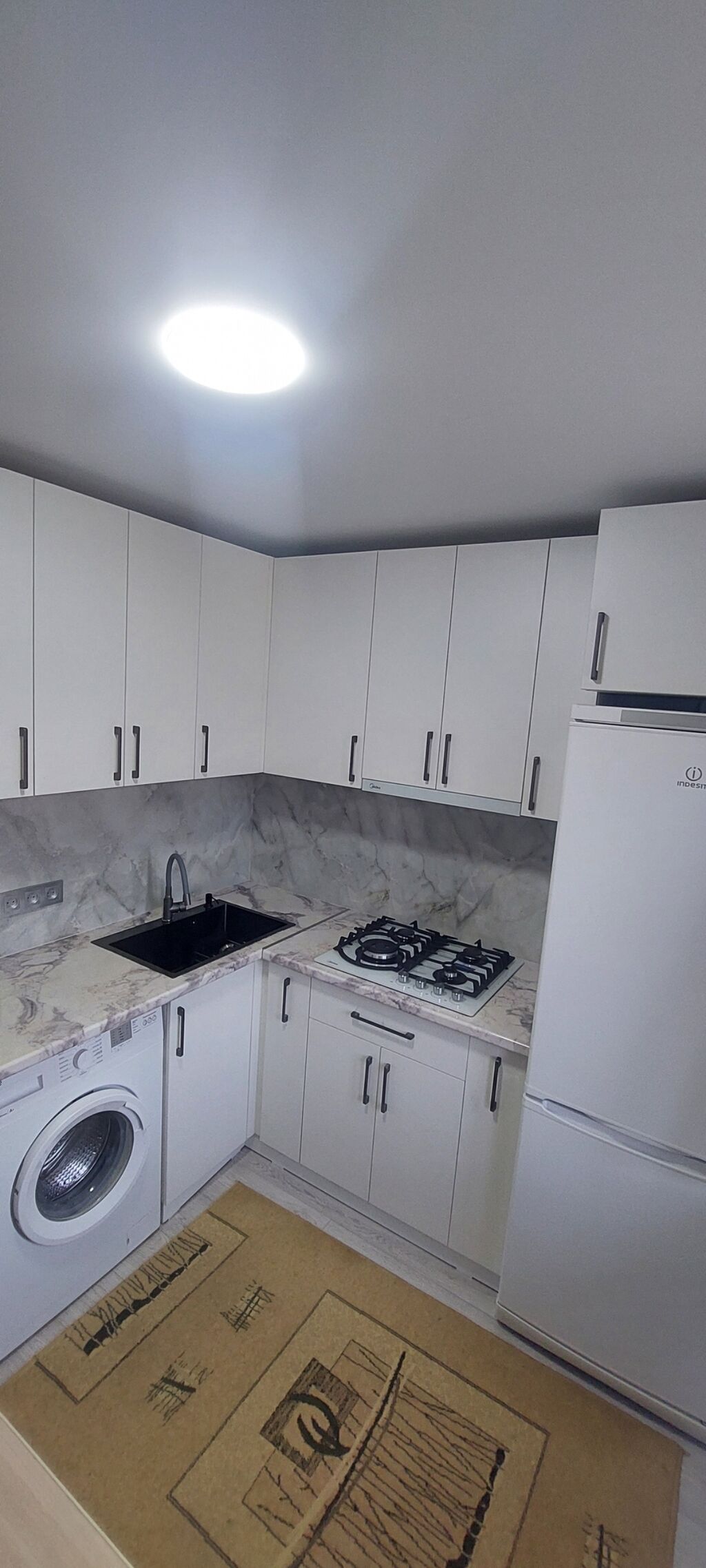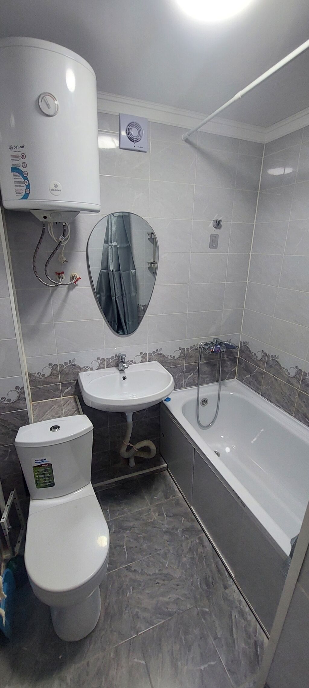 Пол — ламинат, потолки натяжные, санузел облицован кафелем. Новая сантехника, пластиковые трубы.