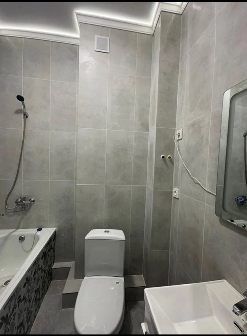 Совмещённая ванная комната: ванна с душем, унитаз, умывальник с краном, зеркало, керамическая плитка на стенах и полу, вытяжка