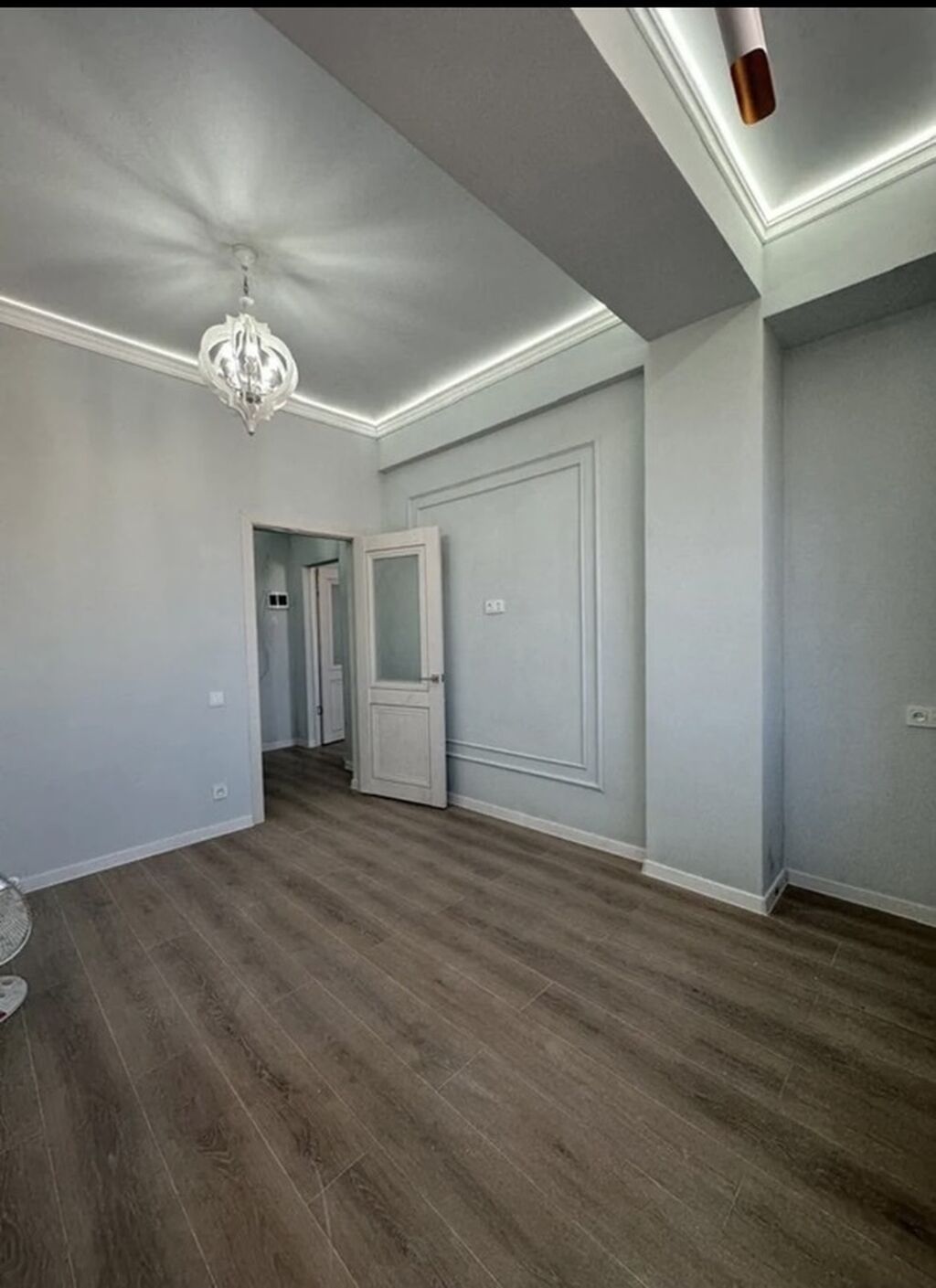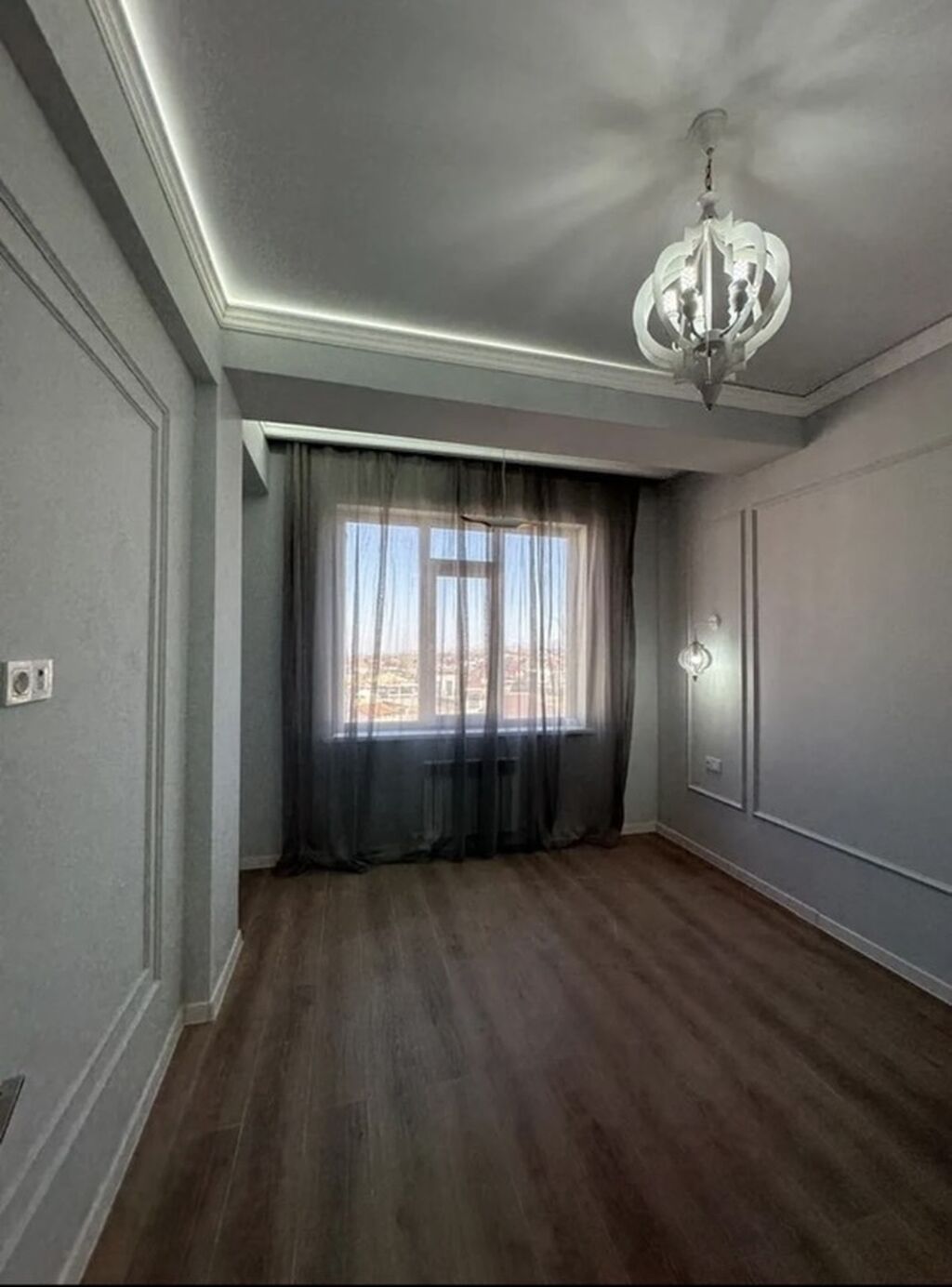 Стены выровнены и окрашены в светло-серые тона, декоративные молдинги