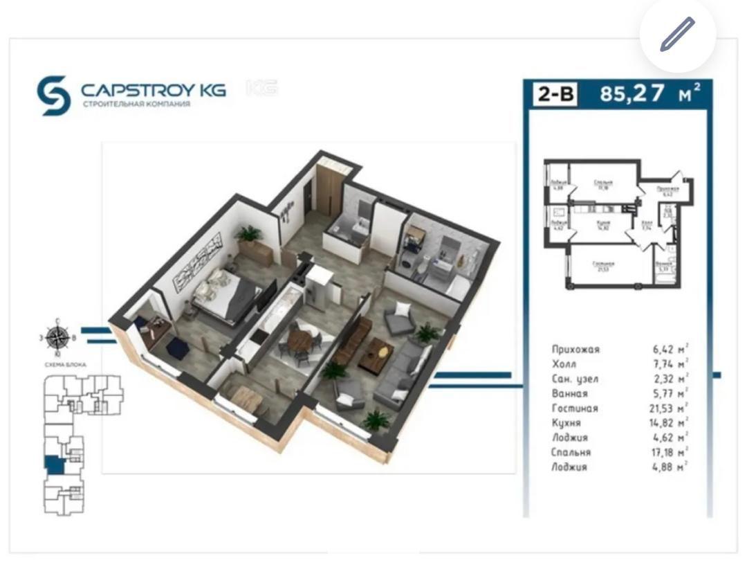 Элитка, 2 ком, 85 м2, этаж 9/12, ж/к Кап Строй Сити (Capstroy City), Сост: Сдан ПСО