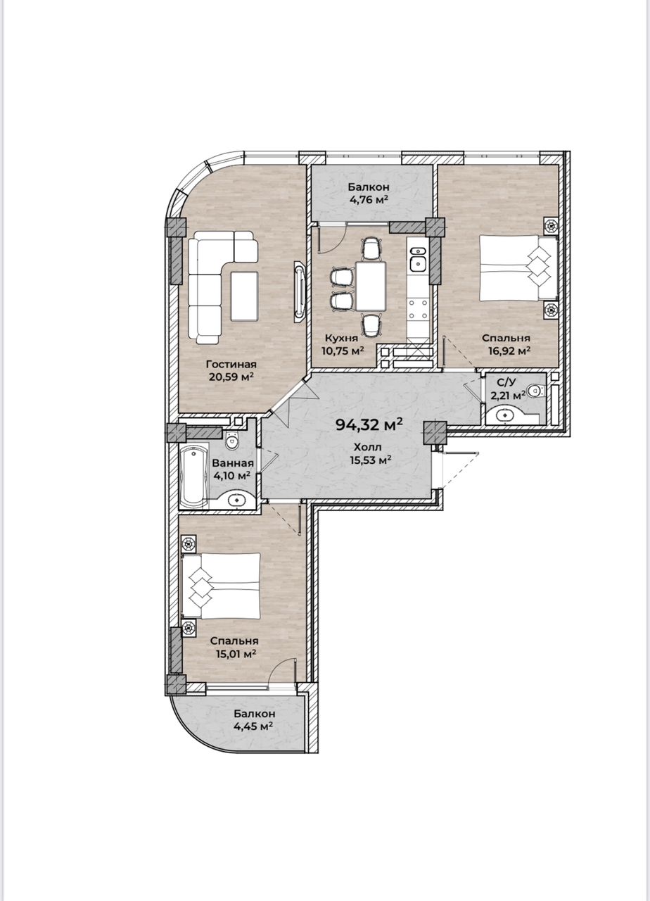 📐 Площадь квартиры — 94,3 м² + просторная терраса 39 м²