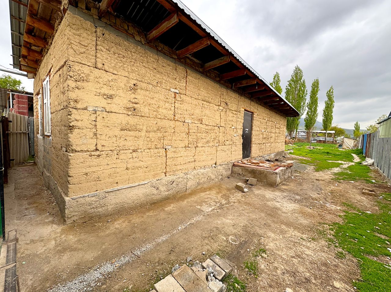 На участке — дом из самана, 3 комнаты, можно жить или переделать под хозпостройки. Коммуникации: электричество, вода